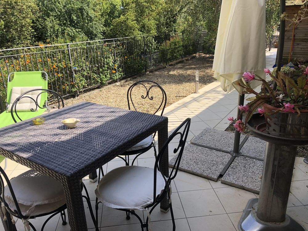 Large terrace and private garden equipped with outdoor facilities, tables, chairs, gazebo and sun beds